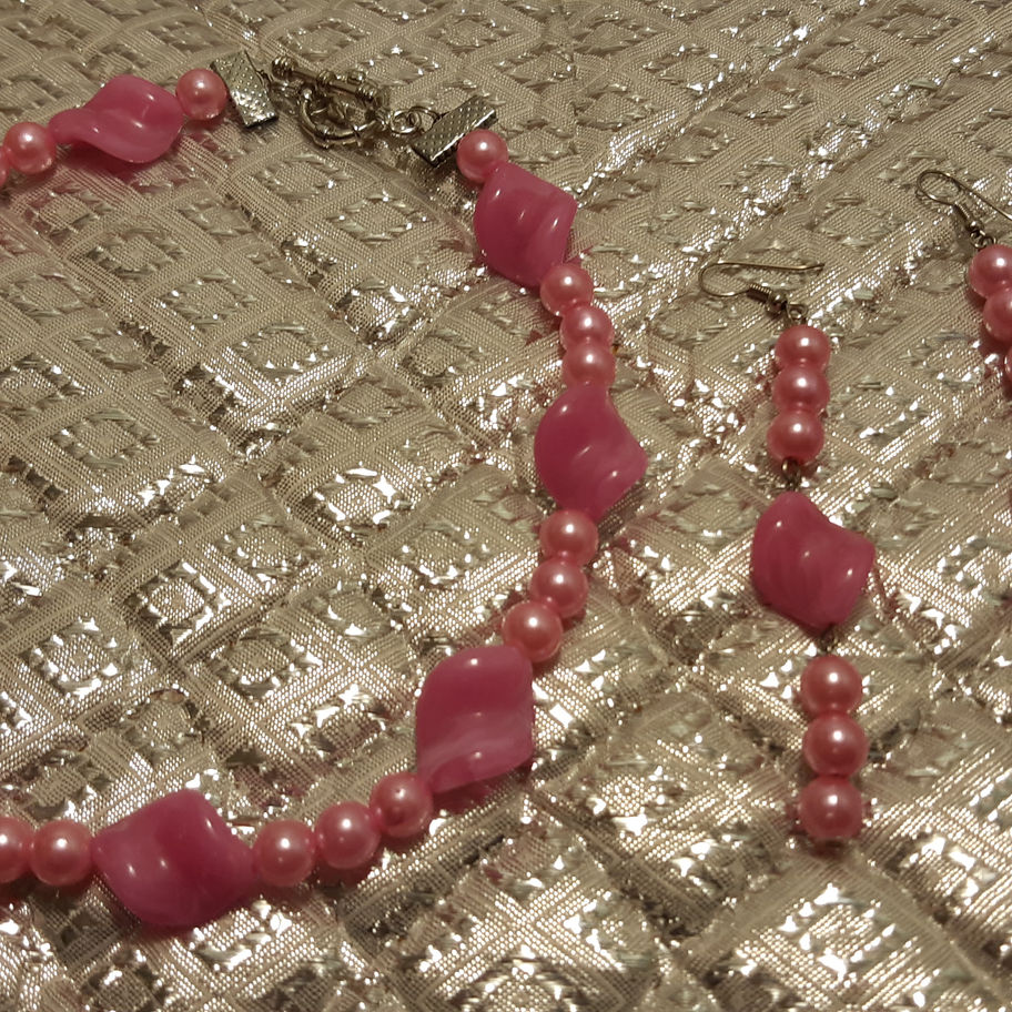 Collier avec boucles d'oreilles couleur rose avec jolie pierre.